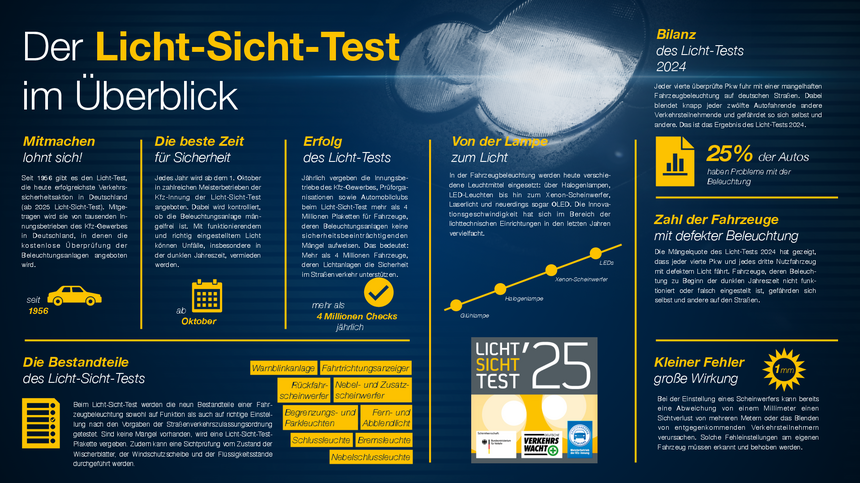 Der Licht-Sicht-Test ist ein Service, bei dem Kfz-Meisterbetriebe kleine Licht-Mängel in der Regel sofort und kostenlos beheben. Nur notwendige Ersatzteile sowie umfangreiche Diagnose- und Einstellarbeiten müssen bezahlt werden. Die bundesweite Aktion gibt es bereits seit 1956, sie wird gemeinsam vom Kraftfahrzeuggewerbe und der Verkehrswacht organisiert.