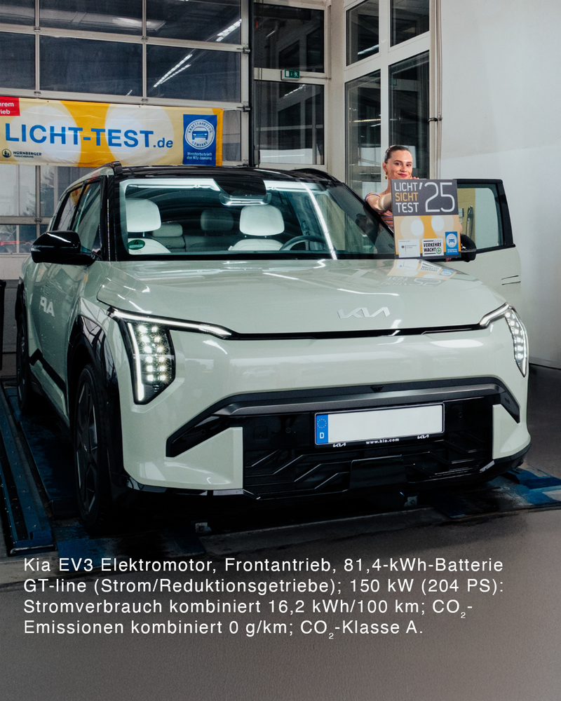 Licht-Sicht-Test-Kunden können in diesem Jahr einen Kia EV3 im Rahmen des Automietservices „Kia Drive“ für die Dauer von zwölf Monaten gewinnen. Zusätzlich gibt es wieder die Chance auf eines von 75 Auto Bild-Abos, eines von 20 OSRAM LED-Nachrüst-Sets oder eines von 5 Fahrsicherheitstrainings der Deutschen Verkehrswacht. Teilnehmer brauchen dazu nur ein Bild von sich und der Plakette auf der Windschutzscheibe auf licht-test.de hochladen und schreiben, warum sie zum Licht-Sicht-Test fahren. Gewinnspielflyer können in kleineren Mengen nachbestellt werden, solange der Vorrat reicht.
